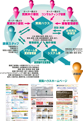 そうした社会環境のなかで、私達東商ハウス株式会社では売買仲介部、賃貸仲介部、ホームサービス事業部、情報システム部、および外部提携スタッフの連携により、プランニング・施工・仲介、さらには物件の管理・税務コンサルティングにいたるまで、不動産に関するあらゆる業務をトータルにサポート。ライフプランナーとしての存在意義をさらに高めています。