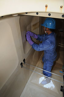人体に影響のない特殊な薬品で、貯水槽内部に発生した藻や水垢などによる汚れを落とした後、これも人体に影響のない消毒用薬品を特殊ノズルによって憤霧し、清掃作業を進めていきます。そして、最終的には、水質検査を行い、行政の定めた水質基準に合致するかどうかをチェックします。その間、場所によっては数時間断水になることがありますので、事前に日時の打ち合わせを行い、なるべく支障のない時を選んで作業を行います。