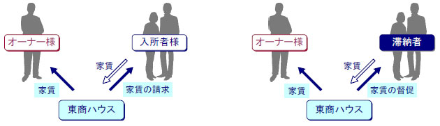 オーナー様が、大切な資産から確実に収益を得るため、東商ハウスでは、毎月の請求書の発行・送付から、水道検針や水道代の徴収、金融機関での自動引き落としの案内や奨励、家賃に関するトラブルの法的解決に至るまで、オーナー様と入居者様の間に立って、安心できる家賃管理をお約束します。