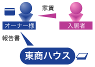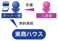 家賃の滞納。オーナーにとって、これが最も悩みの種でしょう。特に、滞納者への請求は、気が重くわずらわしいものです。オーナー様が、大切な資産から確実に収益を得るため、東商ハウスでは、毎月の請求書の発行・送付から、水道検針や水道代の徴収、金融機関での自動引き落としの案内や奨励、家賃に関するトラブルの法的解決にいたるまで、オーナーと入居者の間に立って、安心できる家賃管理をお約束します。