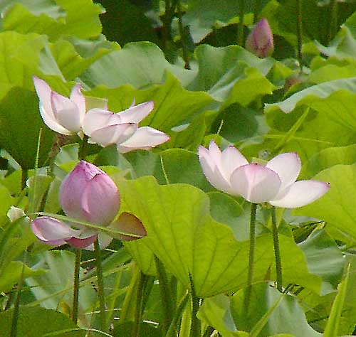 | 初夏の季節、山ヶ池の蓮は瑞々しい葉とともに淡いピンクの大きな花を次々と咲かせます |