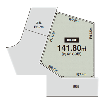 | 建築条件無し 土地面積141.80㎡ (約42.89坪) 北西角地 陽当り・通風良好 |