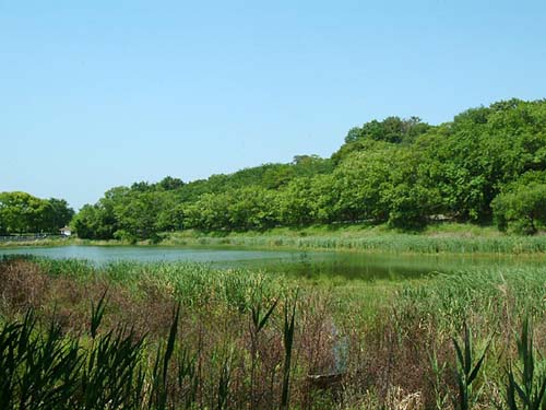 乗馬センターの前には うずわ池が広がる。ヨシやマコモが茂り水鳥も訪れる