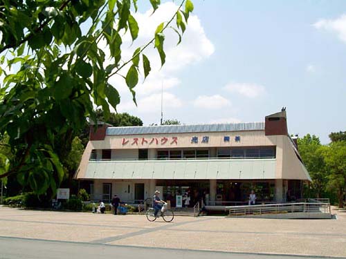 円形花壇そばのレストハウス。1Fには売店と休憩所、2Fには食堂が備わっています
