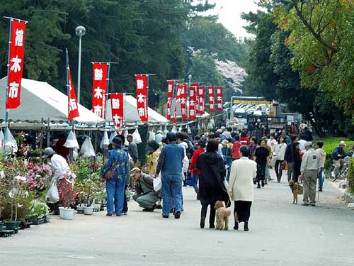 レストハウスすぐ左側の道では定期的に中規模の植木市が開かれ、人気を博しています