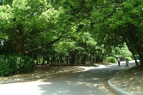 レストハウス前から公園の各地へ通じる道は、木々が茂り木陰が優しく落ちています