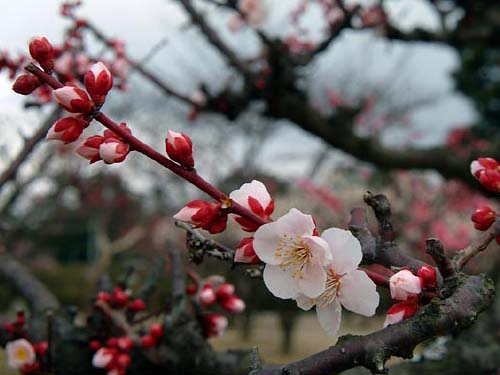 春まだ寒い3月初旬、紅白の梅の花が薄紅色に霞んで浮かぶ姿は幻想的です