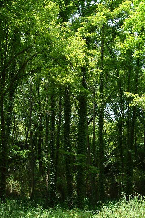 初夏の風景。この木々の根元には覗き込まないと見えないキショウブの花園があります