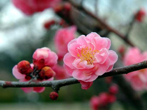 春まだ寒い3月初旬、紅白の梅の花が薄紅色に霞んで浮かぶ姿は幻想的です