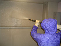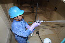 人体に影響のない特殊な薬品で、貯水槽内部に発生した藻や水垢などによる汚れを落とした後、これも人体に影響のない消毒用薬品を特殊ノズルによって憤霧し、清掃作業を進めていきます。そして、最終的には、水質検査を行い、行政の定めた水質基準に合致するかどうかをチェックします。その間、場所によっては数時間断水になることがありますので、事前に日時の打ち合わせを行い、なるべく支障のない時を選んで作業を行います。