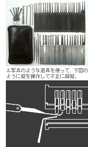 この手口に使われるピッキングツールと呼ばれる特殊な工具は、恐ろしいことに通信販売や店頭で堂々と販売されていたこともありました。現在は、平成15年 6月に施行された「特殊解錠用具所持禁止法」によって、こうした工具を正当な理由なく販売や所持していた場合、罰せられることになりましたが、通信販売で既に低価格で大量に売られていたため、ほとんど一般化しています。